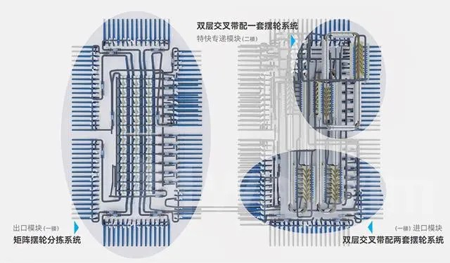 配置一套雙層小件分揀機系統(tǒng)用于特快專遞小件和文件處理,配置一套矩陣擺輪分揀系統(tǒng)用于特快專遞大件、總包郵件的處理和傳輸。